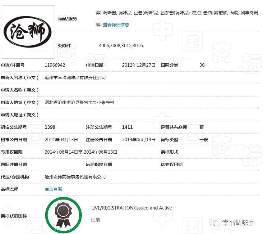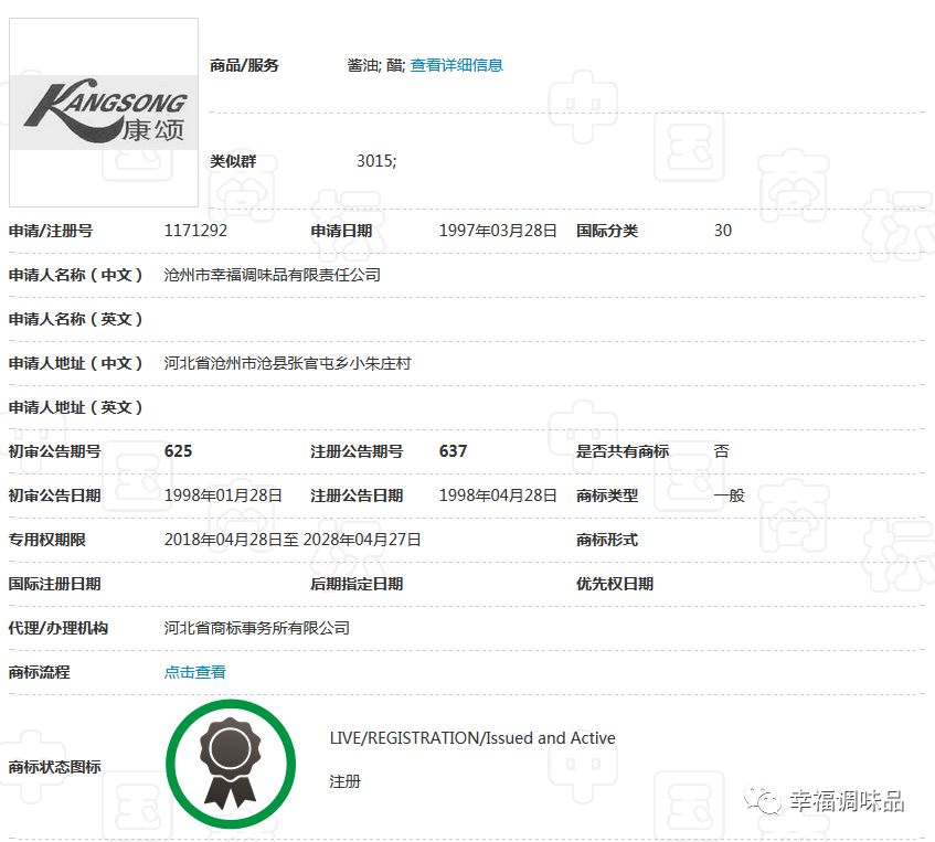 幸福調(diào)味品自創(chuàng)辦30多年以來,在工商部門指導(dǎo)下,充分認(rèn)識(shí)到商標(biāo)品牌的重要性,始終堅(jiān)持走創(chuàng)品牌的路子。公司的“康頌”商標(biāo)于1997年在30類,糖、茶、糕點(diǎn)、調(diào)味品類獲核準(zhǔn)注冊后,并根據(jù)市場需要,先后又注冊了包括“滄獅”中文及拼音在內(nèi)的等商標(biāo);形成了涵蓋多類別、多商品、多層次的商標(biāo)品牌庫。